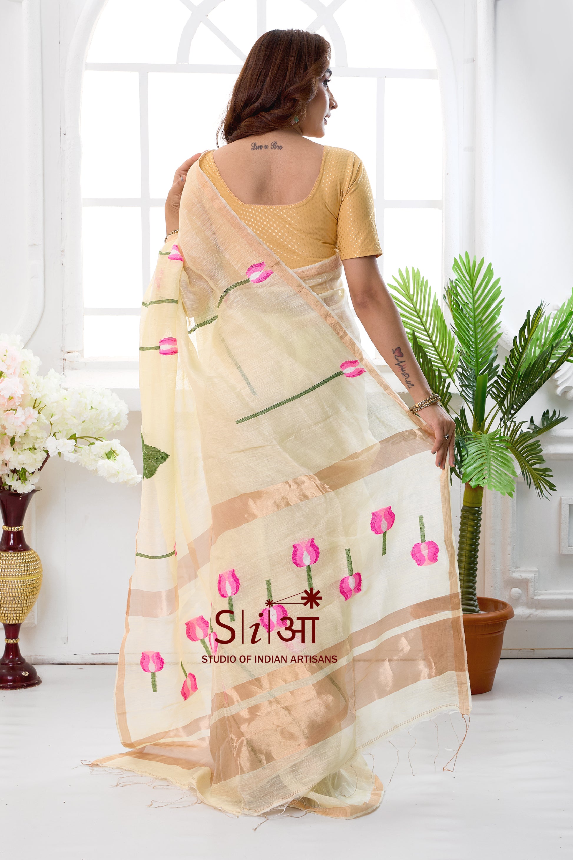ROYAL IVORY BLOOM- SILK LINEN SAREE