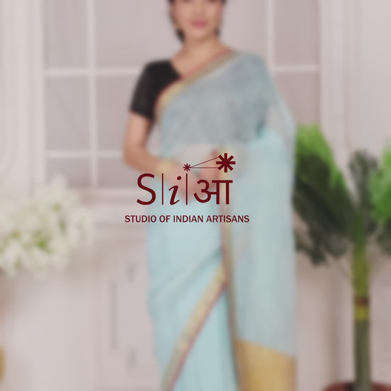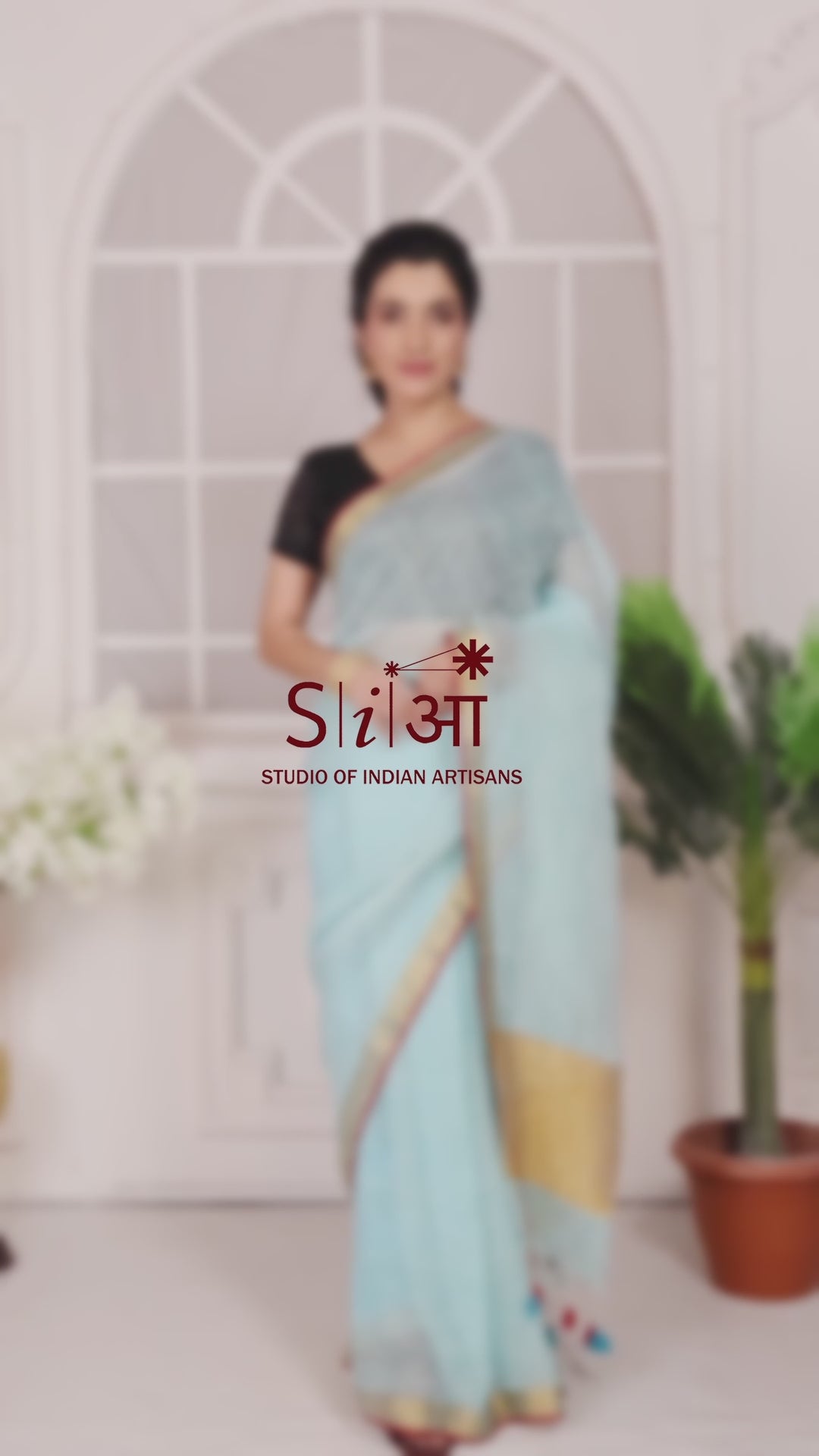 The Sunehra Aasmaan saree is a graceful blend of minimal luxury and tradition.Woven in Linen, a fabric loved for its breathability, natural sheen, and fluid drape, it brings comfort while exuding understated elegance. This saree blends tradition and sophistication, making it perfect for both festive occasions, office wear, and everyday grandeur.